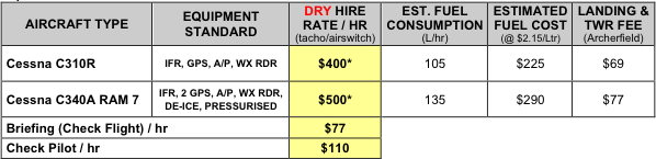 ¬Landing fees, fuel differential costs and Airservices Australia fees incurred as part of the aircraft hire will be charged to the customer.
